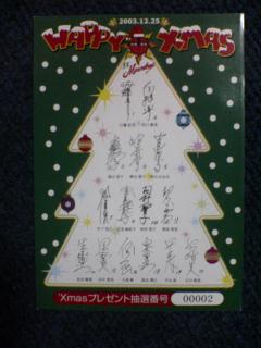 10V大阪大会が2003.12.25にありました。入場者が貰えたクリスマスカードです。 仕事で行かれなかったのですが僕が谷口隊長ファンと知っていた方が抽選番号00002のクリスマスカードを贈ってくれました。 裏面は隊長のサイン入りでした。最高のクリスマスプレゼントでした。