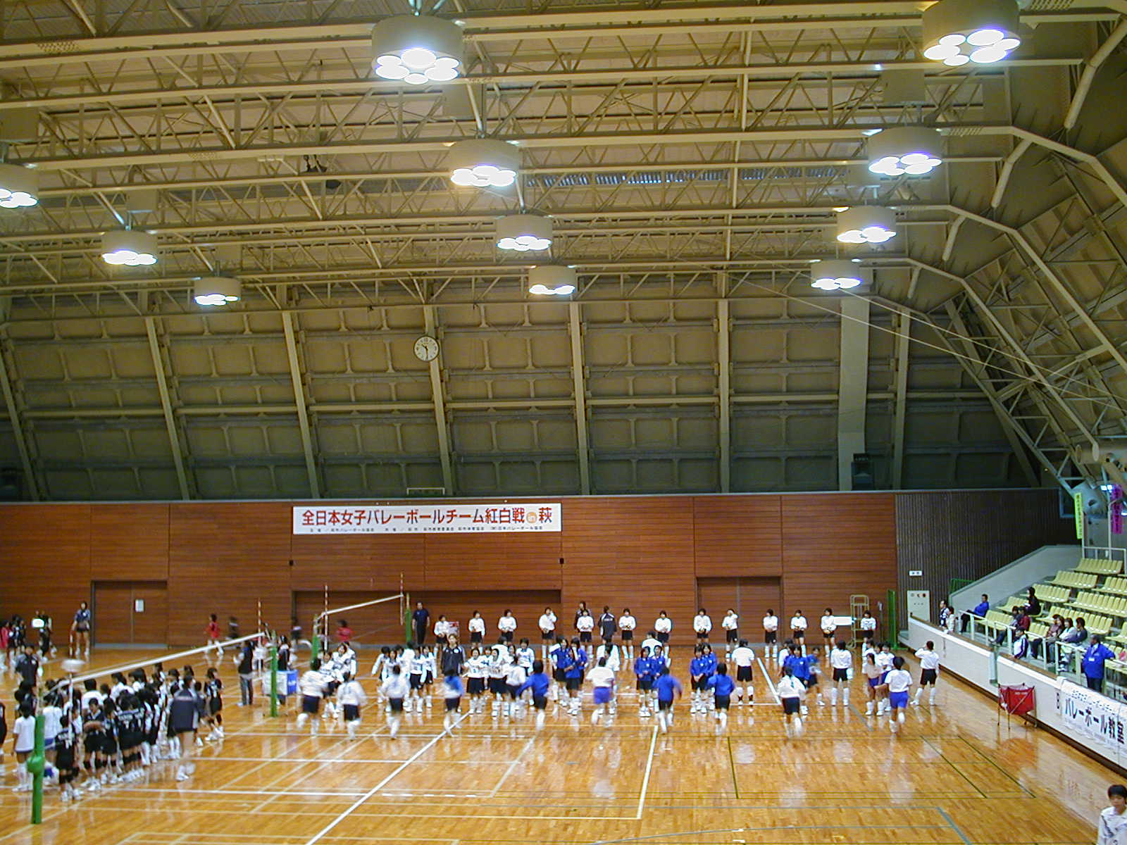 三面コートの6ケ所に分かれてバレー教室。 画面奥のコート左側に大山カナ・栗原コウ組、右側に吉原トモ・辻チエ組、 中央のコート左側に佐野リョウ・杉山スギ組、右側に佐々木レオ・大村カナコ組、 (ネットは見えないけど)手前コート左側に高橋シン・宝来マホ組、右側に竹下テン・鈴木ヒロ組。