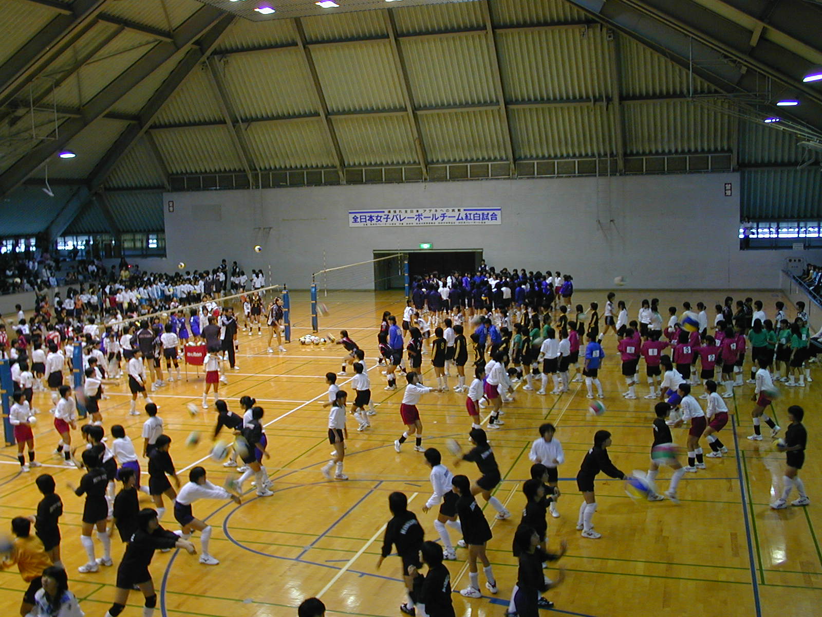 この日も三面コートの6ケ所に分かれてバレー教室。 画面奥のコート左側に大山カナ・栗原コウ組、右側に吉原トモ・辻チエ組、 中央のコート左側に佐野リョウ・杉山スギ組、右側に佐々木レオ・大村カナコ組、 (ネットは見えないけど)手前コート左側に高橋シン・宝来マホ組、右側に竹下テン・鈴木ヒロ組。