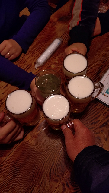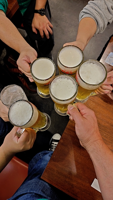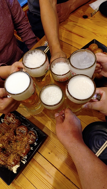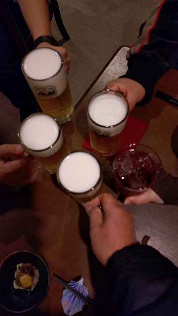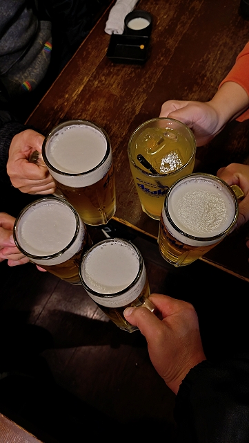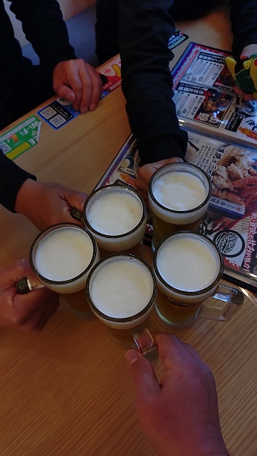 相手チームがマイクを使って挨拶を始めたので会場からとっとと出ました。昨日と同じく、座るために歩いて1つ手前のバス停留所に行き、10分待って乗車して武蔵小杉駅に移動。JR→JR→第三セクターと乗り継いでマーヴェOGの店に行きました。20時頃からマーヴェサポ5名で「今日もお疲れちゃ~ん!」と乾杯しました。