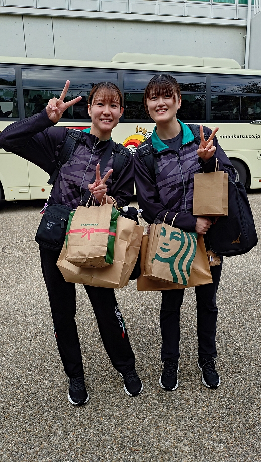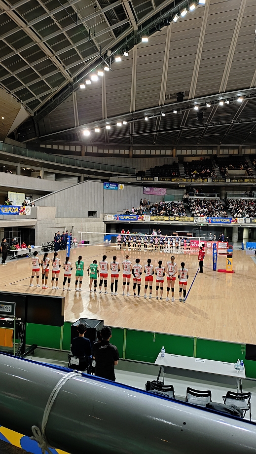 ベンチ入りは、サミ、リン、ミコ、ヒトミ、リセ、Cミズキ、エリナ、サカキ、Lマナ、ユウカ、アズ、ハルカ、アメ、コユミ、の14名。メンバーは昨日と同じ。「ナルは帯同していない」とチームのSNSに今朝載っていました。昨日は普通に帯同していましが残念です。今日のリベロは1人制。