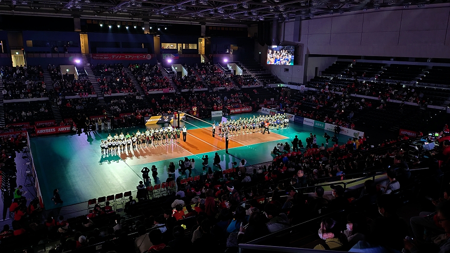 今日は平日金曜日。開幕戦で有給休暇を取ったため今日は有給休暇は取りづらい雰囲気(笑)。夕方まで仕事をして私服に着替えて、応援グッズとスーツを持って会社を出ました。JR→JRと乗り継いで武蔵小杉駅には17時半頃に到着。タクって会場に移動。マーヴェ受付机があったのでスタッフに挨拶をして、ヒトミさんへのお土産をボックスに入れておきました。会場内に入り、先に来ていた関西や東海や関東のマーヴェサポ達と合流。応援道具を準備して試合開始を待ちました。
