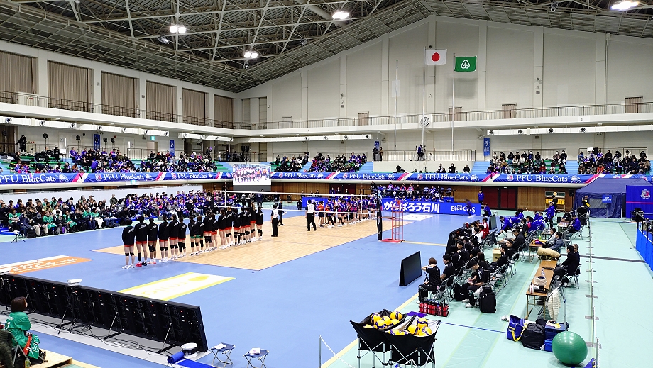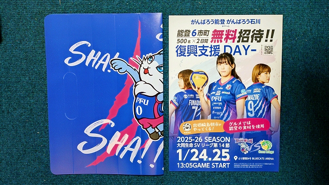 目が覚めたら23時過ぎ。昨日のマーヴェの試合を第2セットから見て、TVerで探偵ナイトスクープと名探偵コナンを見て、ホテルの無料VODでナイツ独演会を見て、昨夜コンビニで買った朝食を食べながら昨日の日記を書いてシャワーを浴びて、サンデーモーニングの喝!を見ましたが、先週日曜日の皇后杯決勝で相手チームが優勝出来なかったからか放送がありませんでした。はいはい、想定内でしたよ。ゴジュウジャーを見ようとしましたが放送自体がありませんでした。身支度をして10時にホテルをチェックアウトしました。小松駅に行くとマーヴェサポ達がいました。ヒトミにお土産を買ってから10:45発の無料シャトルバスに乗り会場に向かいました。会場に着き寒い中、列に並んで一般客会場開門時間11:15になったので入場しました。今日も無料チケット1000枚配布していたという事でスタンド席は埋まりました。昨日と同じ場所のスタンド席に行き荷物を置いてコート内を見るとマーヴェがウォーミングアップをしていたのでユウカブランケットを掲げるとユウカが応えてくれました。よ~し、これで今日も大丈夫だ(笑)(と、この時は思っていました)。スタンド席から階段を降りてマーヴェ受付にヒトミへの差し入れを預けました。スタンド席に戻り応援道具を準備したりマーヴェ話をしたりしてグダグダと時間を潰しました。今日は1名増えて6名で緑化活動をする事となりました。