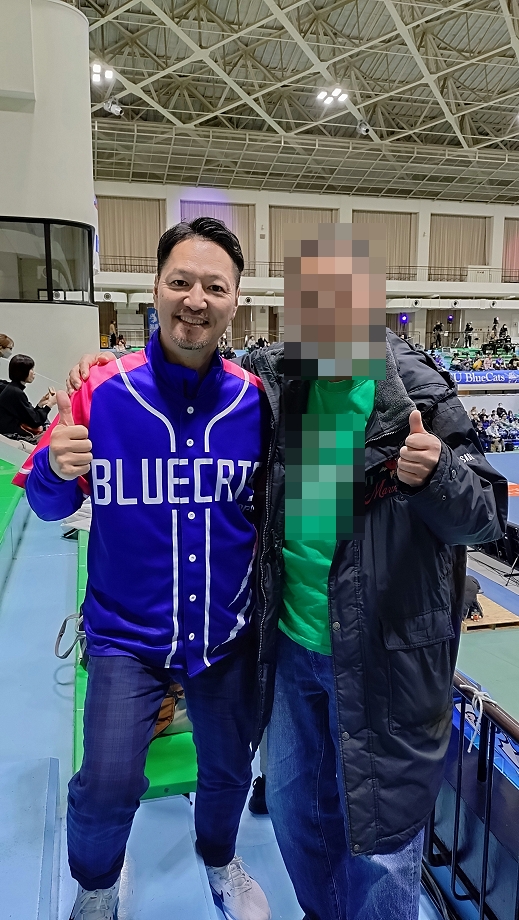 前回の石川遠征の時もいましたが、相手チームの場内マッチナビゲーターが30年来の知り合いなので昨日・今日と試合前にグダグダと喋っていました。